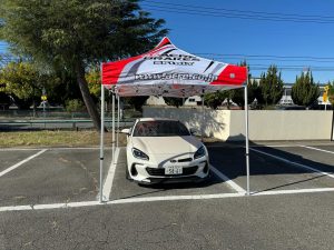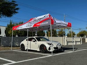 日本の駐車場企画は2.5m×5mでほぼ統一されています。最近はGAZOOラリーチャレンジ等で道の駅の駐車場を使用したりするケースが増えこのサイズをオーバーするとテントが使えない状況です。そこで標準仕様に無い駐車場サイズを製作する事となりました。写真は試作品のため、6本脚ですが製品は4本脚で販売致します。4本脚の場合、テント内で車のドアの開閉ができるようになり、作業性の向上になります。