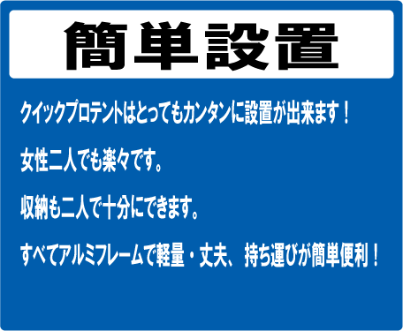テンプレートをダウンロードしてお絵かきしてください。ロゴの配置を決めてテントの色が決まったら取り合えず、完成までもう少しです。簡単なデザインでしたらクイックプロがお手伝いします。但し、ロゴが決まっている場合は送って頂きます。当社でデザインは3回まで無料で起こします。もちろん、プロのデザイナーさんにデザインを任せられても大丈夫です。他社製品にありがちなテントの価格が安価でも、ロゴ入れ等の印刷代金が高額でトータル高くなるテントに比べてクイックプロは安心のワンプライスです。天幕・フレーム・キャリーバッグが3点セットの価格でオプションの横幕や雨とい等を追加しない限り印刷代金がかからないので、ワンプライスなんです。 色の指定がある場合はパントーンの色番号を必ず、ご指定ください。丈夫さの秘密