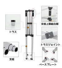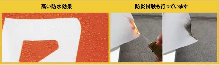 | センター支柱は巻上げ式なのでバネ式と違い突っ張って天幕を傷める事がありません。 | もちろん、防炎試験と防水試験もクリアしています。 |