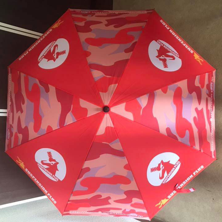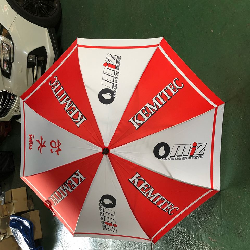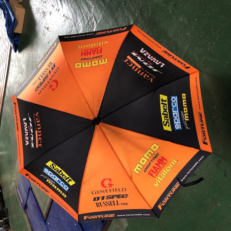 サーキットパラソルまたはレースクィーンアンブレラ等、呼び名は色々ありますが、レースクィーンのアクセサリーとしてだけでなくチームクルーが雨の日にパドックで傘を差して歩くだけでもチームロゴが入っているだけで、宣伝効果は絶大です。